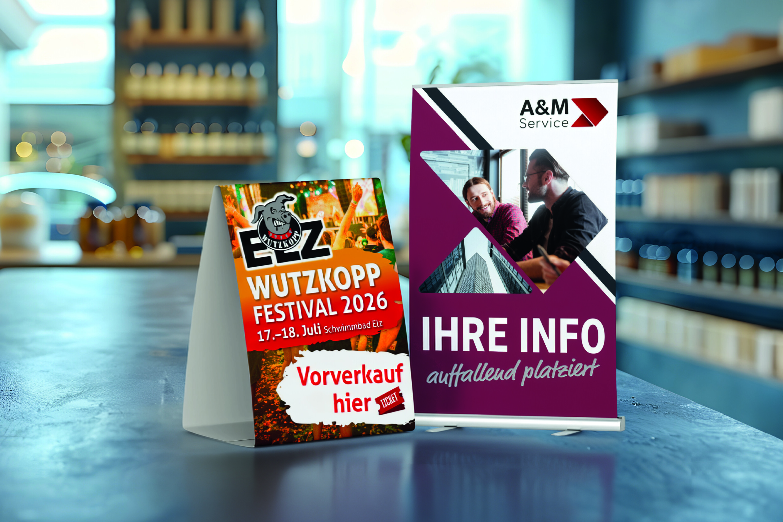 Auch für kleinere Flächen bieten wir durchdachte Lösungen: Kompakte Displays wie Mini Roll-Ups oder Thekenaufsteller eignen sich ideal für Tische, Theken oder begrenzte Präsentationsbereiche – bei gleichzeitig hoher Druckqualität und starker Werbewirkung.