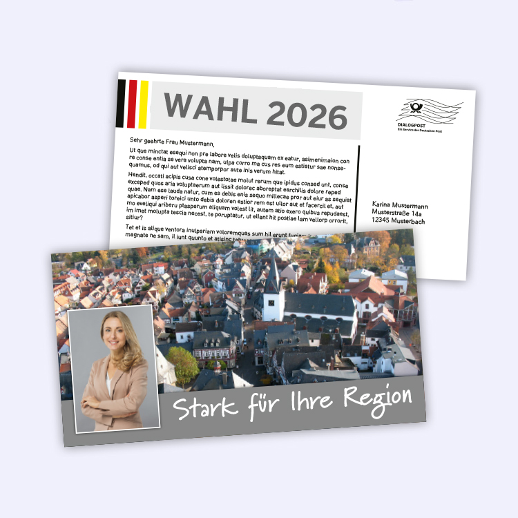 Postaktuell: Sie wählen die Zustellbezirke, in denen Ihre Zielgruppe besonders stark vertreten ist. Ihre Wahlwerbung wird mit der normalen Post vom Briefträger in die Briefkästen verteilt und erreicht somit eine möglichst hohe Aufmerksamkeit.